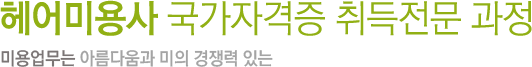 헤어미용사 국가자격증 교육은 이론교육과 일대일 개인지도 및 2인 1조 상호실습을 통하여, 공중위생법상 헤어미용업무를 하는 모든 곳에서 필수로 게시해야 하는 헤어미용사 국가자격증 취득을 목표로 책임 지도를 하고 있습니다. 또한 필기와 실기 교육 외에도 취업 시 전문가로써 누구에게나 환영받을 수 있는 인성교육 및 고객님 응대 소양교육과 예절교육을 철저하게 하고 있습니다.