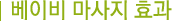 아기의 두뇌발달과 인지력 향상, 행동이 순한 아이로 성장 할 수 있습니다. 아이는 부모의 거울이라는 말처럼 부모의 행동과 말은 아이의 행동과 말로 이어집니다. 따라서 부모와 아이의 정서적인 교감으로써 베이비 마사지는 중요합니다. 베이비 마사지는 신체 성장을 도와주며 면역체계가 좋아지고 편안한 잠을 잘 수 있게 해주며 복부 팽창이나 복통 스트레스가 해소되어 몸이 튼튼해지고 잘 자라는데 도움을 줍니다. 특히 호감 가는 웃는 얼굴, 편해 보이는 얼굴, 밝아 보이는 얼굴이 되는데 유아기 때 필수적입니다. 베이비마사지를 해줄 때 천천히 느긋하게 하며 많은 대화와 이야기를 해줌으로써 아이와 정서적 교감과 신체의 편안함, 정신적인 안정으로 밝고 명랑한 아이로 성장하게 될 수 있습니다.