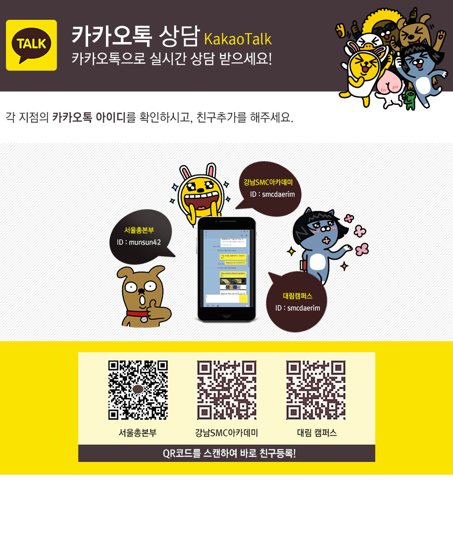 SMC아카데미 본점서울시 종로구 수표로 120 내인빌딩 7층사업자등록번호 : 480-54-00382
