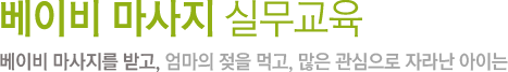 아기의 두뇌발달과 인지력 향상, 행동이 순한 아이로 성장 할 수 있습니다. 아이는 부모의 거울이라는 말처럼 부모의 행동과 말은 아이의 행동과 말로 이어집니다. 따라서 부모와 아이의 정서적인 교감으로써 베이비 마사지는 중요합니다. 베이비 마사지는 신체 성장을 도와주며 면역체계가 좋아지고 편안한 잠을 잘 수 있게 해주며 복부 팽창이나 복통 스트레스가 해소되어 몸이 튼튼해지고 잘 자라는데 도움을 줍니다. 특히 호감 가는 웃는 얼굴, 편해 보이는 얼굴, 밝아 보이는 얼굴이 되는데 유아기 때 필수적입니다. 베이비마사지를 해줄 때 천천히 느긋하게 하며 많은 대화와 이야기를 해줌으로써 아이와 정서적 교감과 신체의 편안함, 정신적인 안정으로 밝고 명랑한 아이로 성장하게 될 수 있습니다.