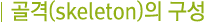 뼈(bones)와 연골(cartilages)의 두 가지로 구성되어 있으며 뼈와 뼈의 연결 : 연골 사이는 인대(ligaments)라고 하는 결합조직의 띠가 보강관절(joints)을 형성합니다.