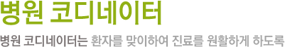 접수, 안내, 처방전 발급, 수술 상담 등 병원 업무 서비스 만족도를 높이고, 병원에서 직원들을 도와서 기획, 환자 관리, 업무개선, 직원 교육, 병원 홍보 마케팅을 담당하며 병원을 발전시키는 역할을 하는 직업인입니다. 코디네이터가 하는 일은 환자를 응대하는 것부터 전화 상담과 환자의 진료상담 관리는 물론 나아가 병원 홍보 마케팅 업무까지 총괄합니다. 관련 경력이 없다면 보통 수납이나 예약, 전화 상담을 하는 리셉션 코디네이터부터 시작하는데 이어 치료 상담 업무를 전담하는 치료 코디네이터, 병원 서비스의 질을 전체적으로 관리하는 병원 매니저, 직원 교육을 담당하는 서비스 코디네이터 등으로 올라갈 수 있으며 병원 서비스 강사나 병원 이미지 컨설턴트, 사내 서비스 강사 등으로 활동할 수 있습니다. 병원코디네이터 과정은 병원 서비스에 대한 이해와 코디네이터 역할을 분명히 알고 코디네이터가 갖춰야 하는 기본적인 서비스 매너와 노하우를 익힐 수 있도록 내용을 구성하여 병원에서 실제로 서비스 실무를 수행하는 데 필요한 실무 스킬을 기르도록 하는 교육과정입니다.
