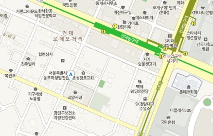 건대입구역 : 2호선 7호선 건대입구 2번 출구 나오셔서 로데로길로 들어와 직진 하시면 왼쪽에 쏠로포차가 있고요. 쏠로포차 정면에 보이는 길로 계속 직진해 들어오시면 있습니다. 걸어서 5분 정도 예상하시면 됩니다.