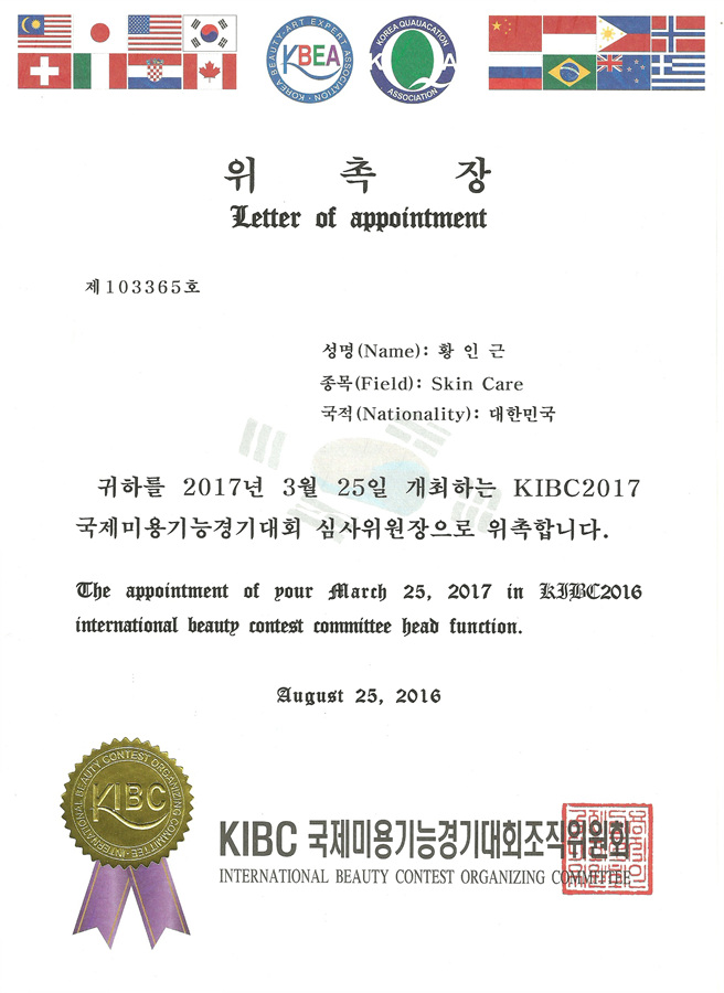 KIBC 국제미용기능경기대회 심사위원장 위촉장 황인근협회장님 |