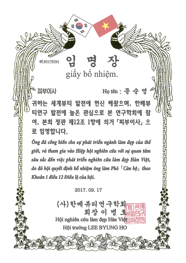 한국 베트남 뷰티연구학회 문순영원장님[피부이사]로 임명 |