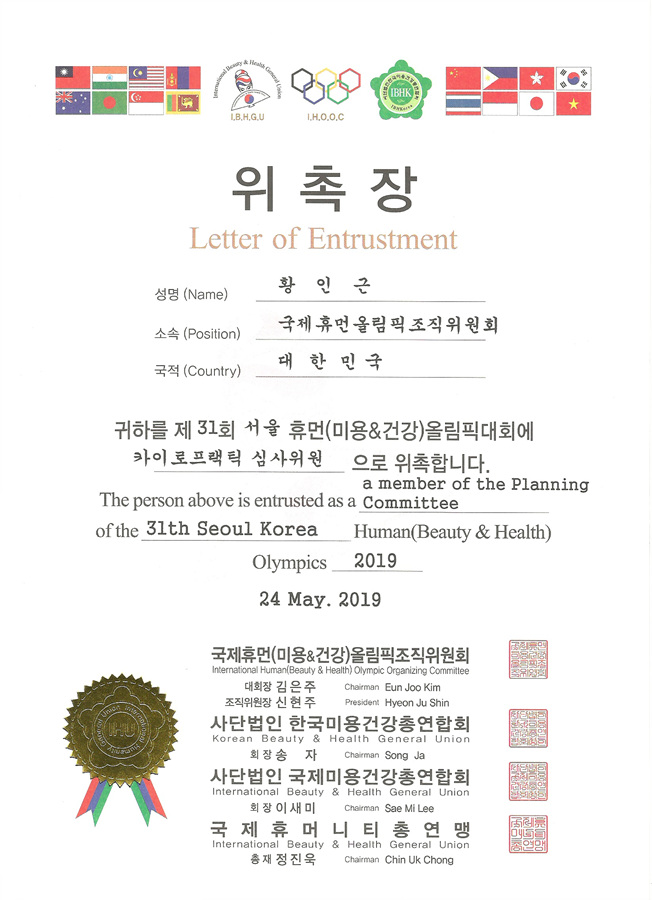 국제 휴먼 올림픽 조직위원회 카이로프랙틱 심사위원 황인근 협회장님 |