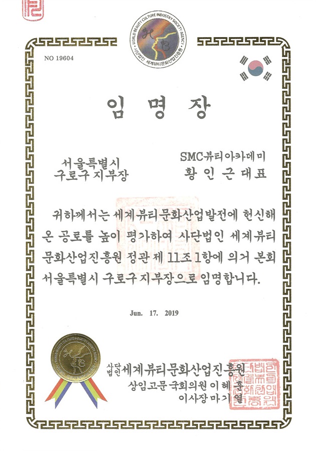 세계뷰티문화산업진흥원 서울특별시 임명장 황인근 협회장님 |