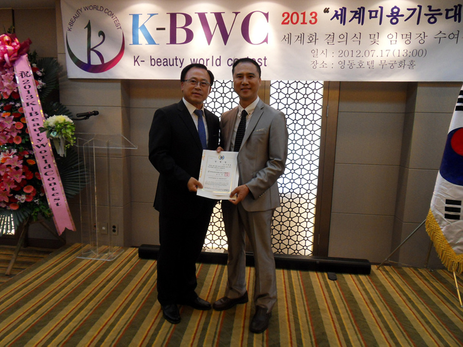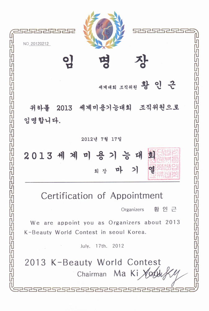 KIBC 국제미용기능경기대회 심사위원장 위촉장 황인근협회장님 |