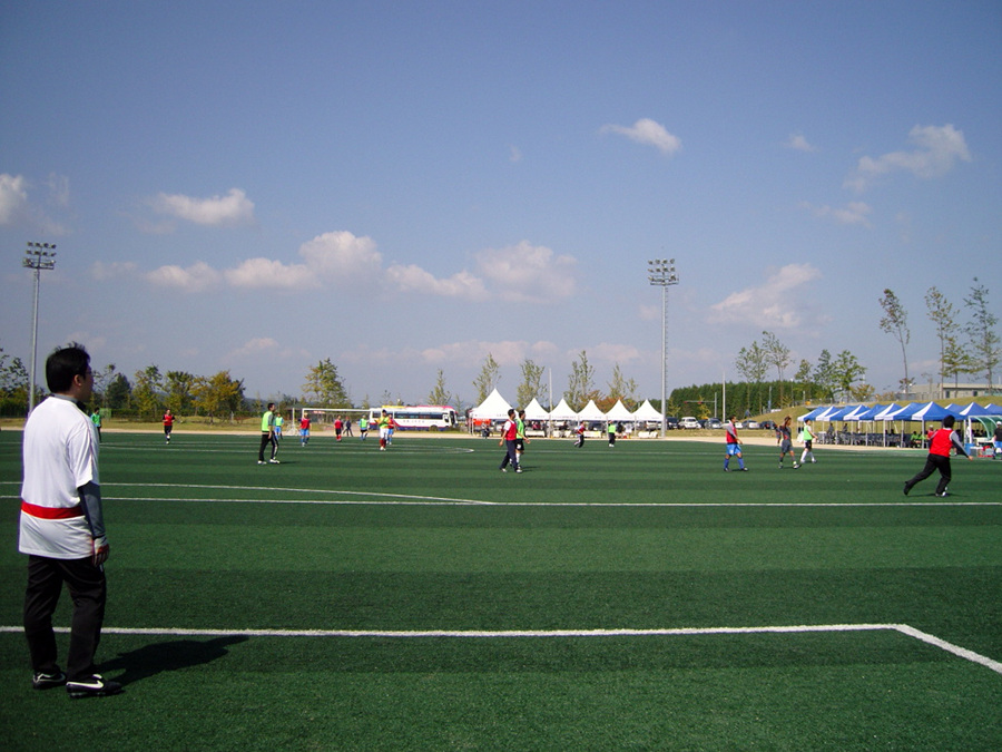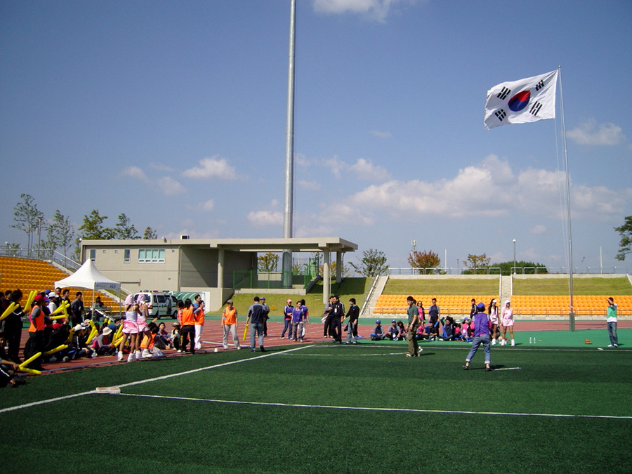 태극기가 휘날리는 하남 종합운동장 마이크로 소프트 직원들 소프트 경기 준비 중