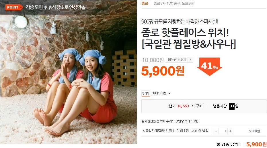 | 하루 숙박료 5900원으로 해결 [종로3가] 국일관사우나 티몬 41% 할인 가격 5900원 | |