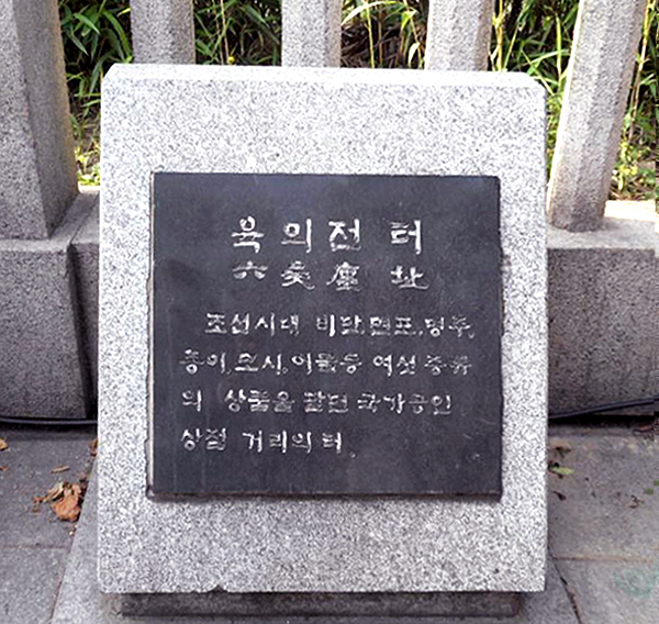 탑골공원 옆에 세워진 육의전 터 표시 여섯 종류의 물품을 팔았다는 뜻