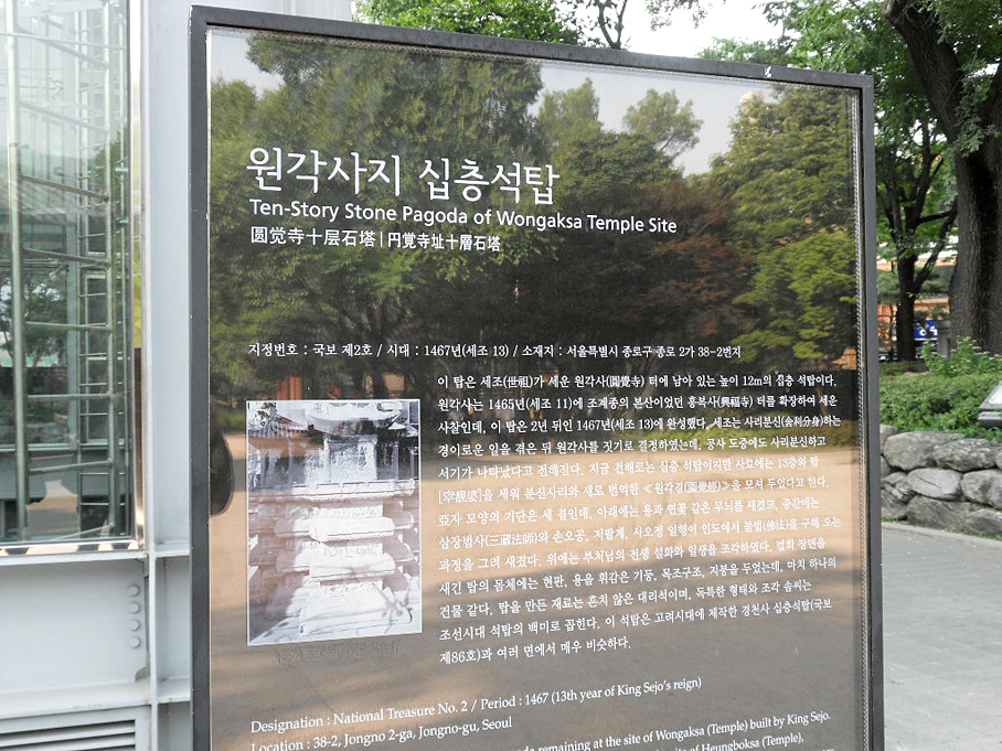 탑골공원(구 파고다공원) 정문 삼일문, 팔각정, 국보 제 2호 원각사지 십층석탑도 보존되어 있습니다.