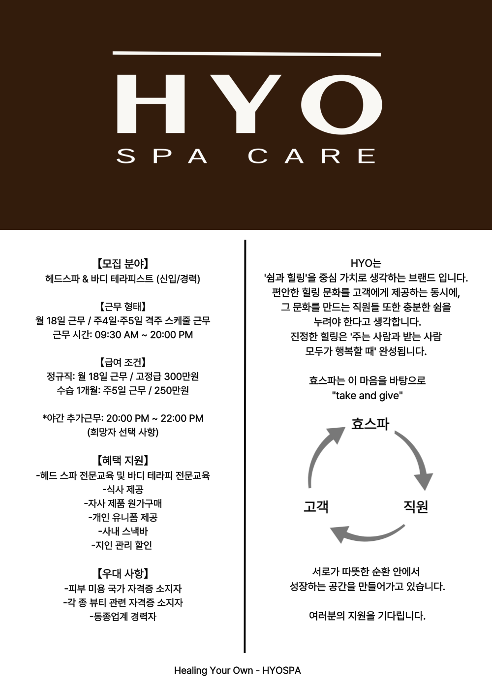 효스파는 `쉼과 힐링`을 중심 가치를 생각하는 스파 브랜드 입니다. 편안한 힐링 문화를 만드는 직원들 또한 충분한 쉼을 누려야 한다고 생각하며, 진정한 힐링은 `주는 사람과 받는 사람 모두가 행복할 때` 완성됩니다. 효스파의 가족 일원이 되실 분을 기다리고 있습니다.