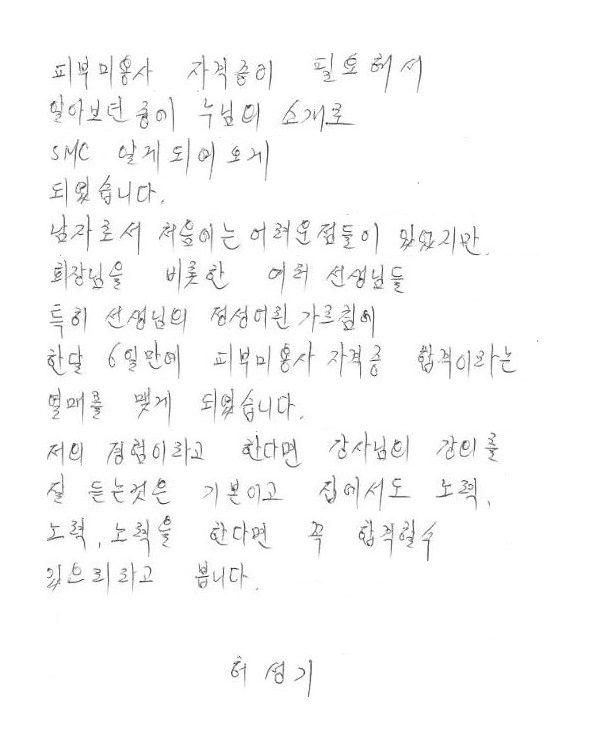 합격! 국가자격증 취득, 김남효님!- 주말반 피부국가자격증 후기자필 |