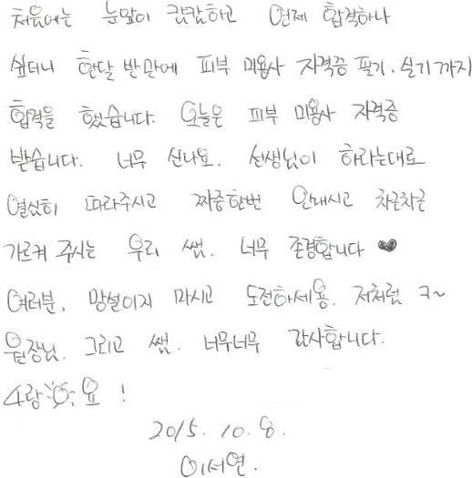 합격! 국가자격증 취득 박정윤님! 피부국가자격증 후기자필 |