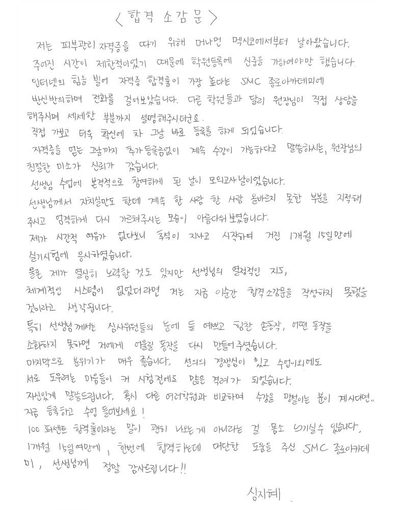 합격! 국가자격증 취득 황선정님(야간반)! 피부국가자격증 후기자필 |