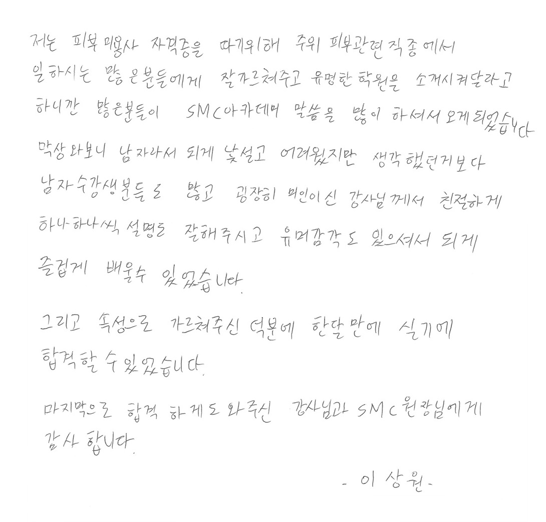 합격! 국가자격증 취득, 김남효님!- 주말반 피부국가자격증 후기자필 |