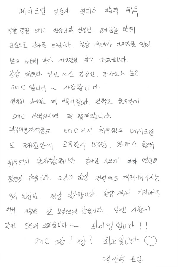 합격! 국가자격증 취득, 김남효님!- 주말반 피부국가자격증 후기자필 |