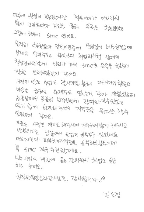 합격! 국가자격증 취득 황선정님(야간반)! 피부국가자격증 후기자필 |