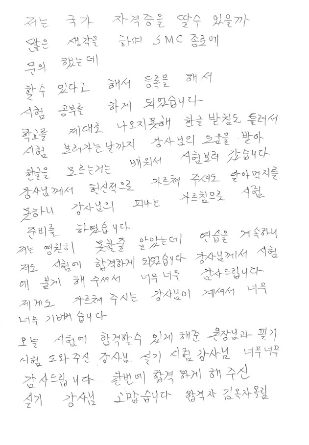 학교를 제대로 나오지를 못해 한글받침도 틀려서 시험 보러 가는 날까지