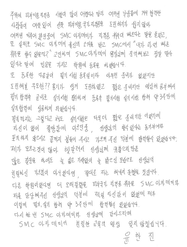 합격! 국가자격증 취득 박정윤님! 피부국가자격증 후기자필 |