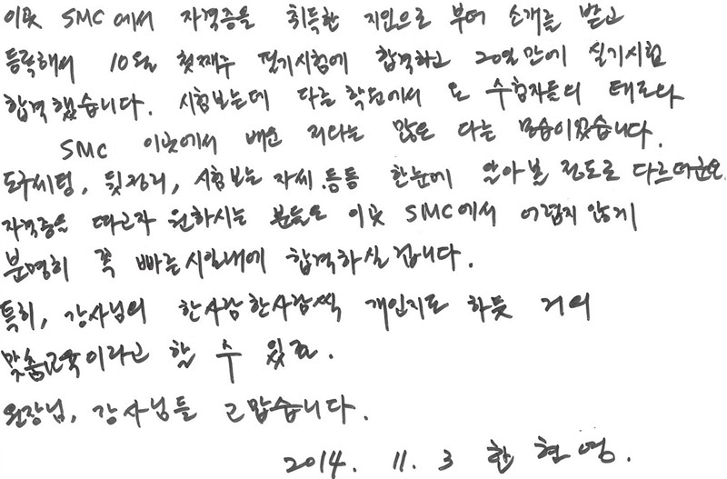 • 강남SMC아카데미 구로디지털단지역점서울시 관악구 시흥대로 558-1 G밸리마인드 5층, 505호사업자등록번호 : 772-11-01570