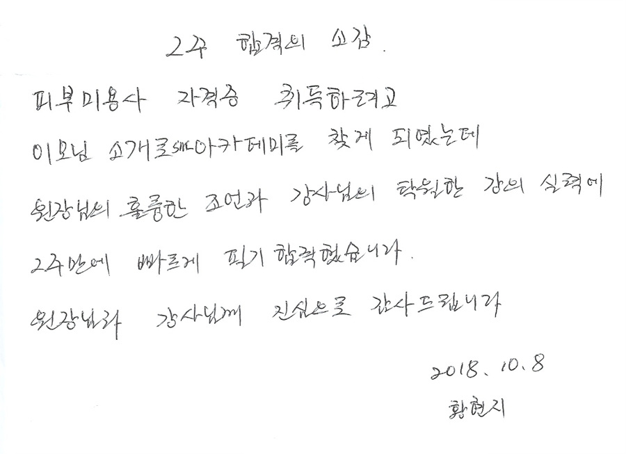피부미용사 국가자격증 필기시험속성 합격후기!! 황현지님 2주만에 합격!!