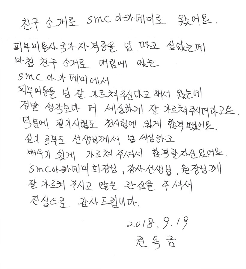 피부미용사 국가자격증 필기시험속성 합격후기!! 권옥금님 한번에 합격!!