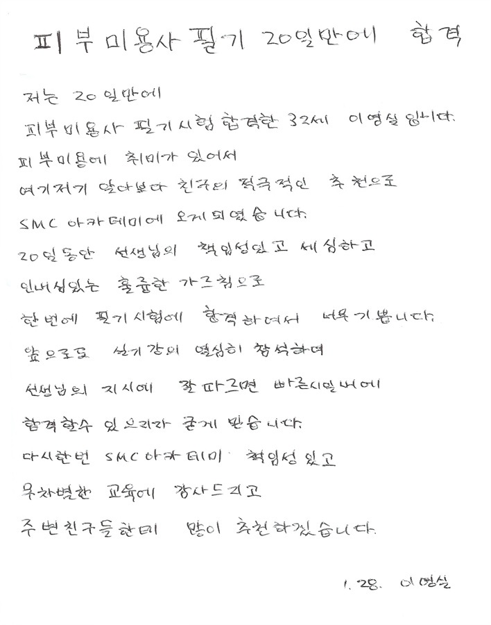 피부미용사 국가자격증 필기시험 속성합격후기!! 이영실님 20일만에 합격!! |