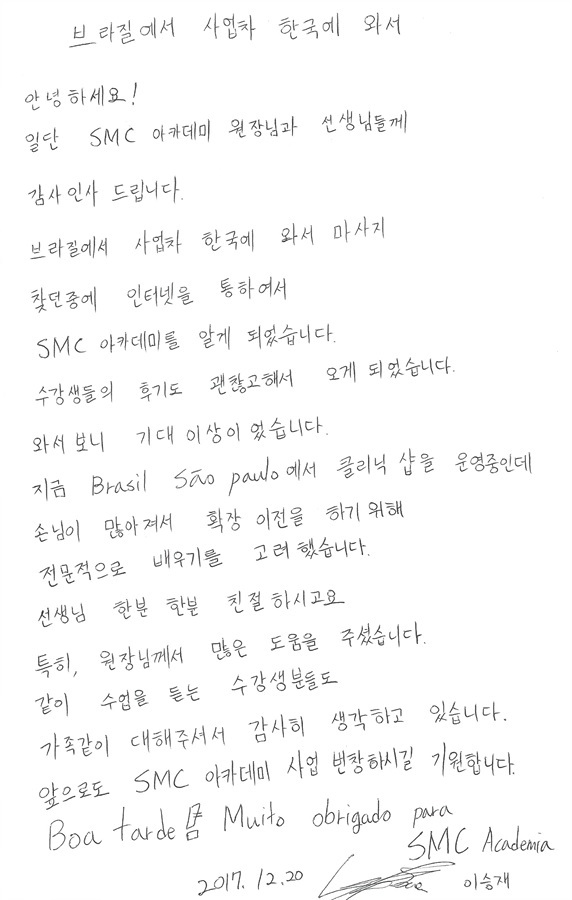 브라질 상파울루에서 오신 이승재님 수강 후기 입니다
