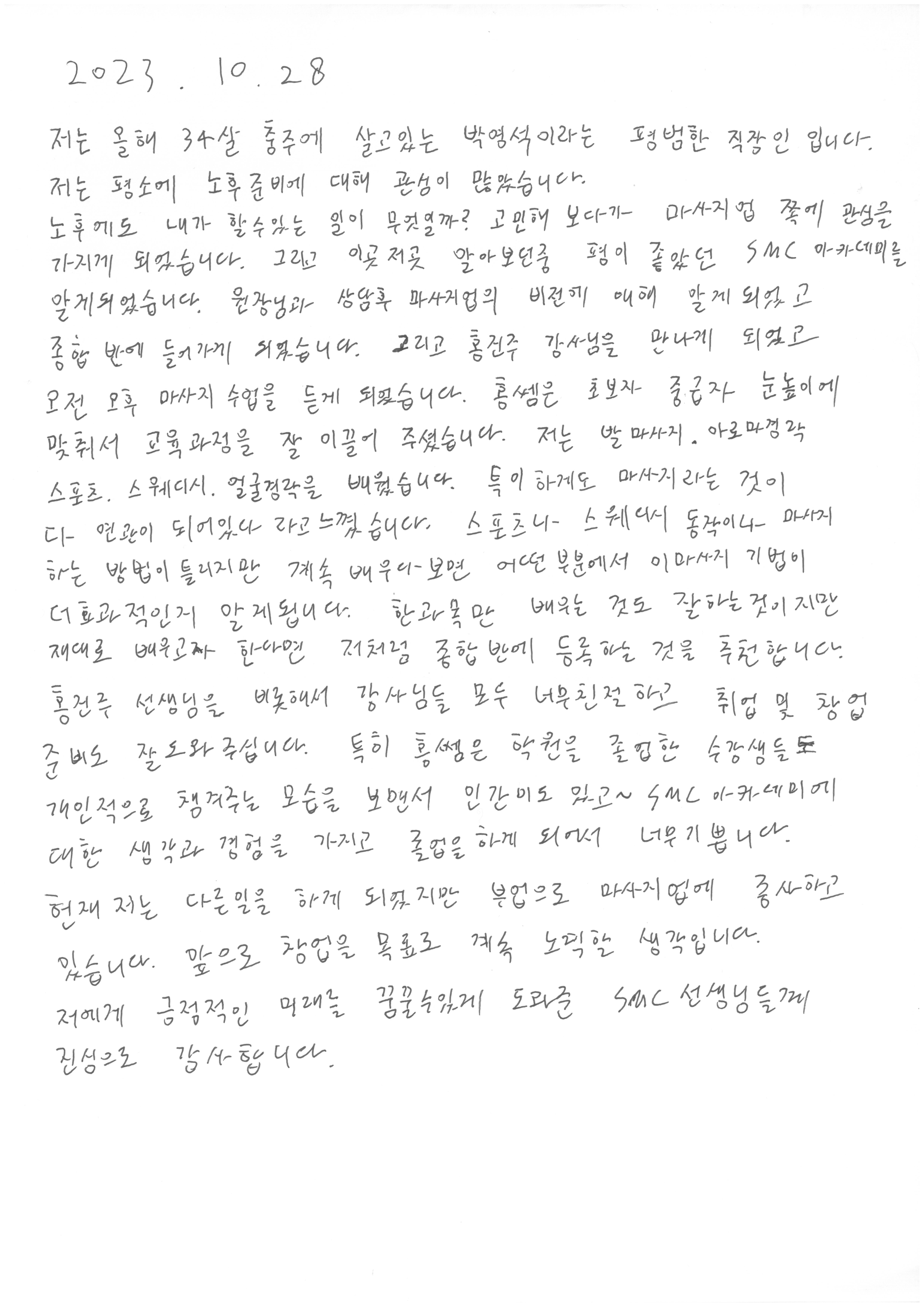 7051 스포츠마사지 교육후기 마사지를 배우고나서 배움의 즐거움찾아    김기석 388