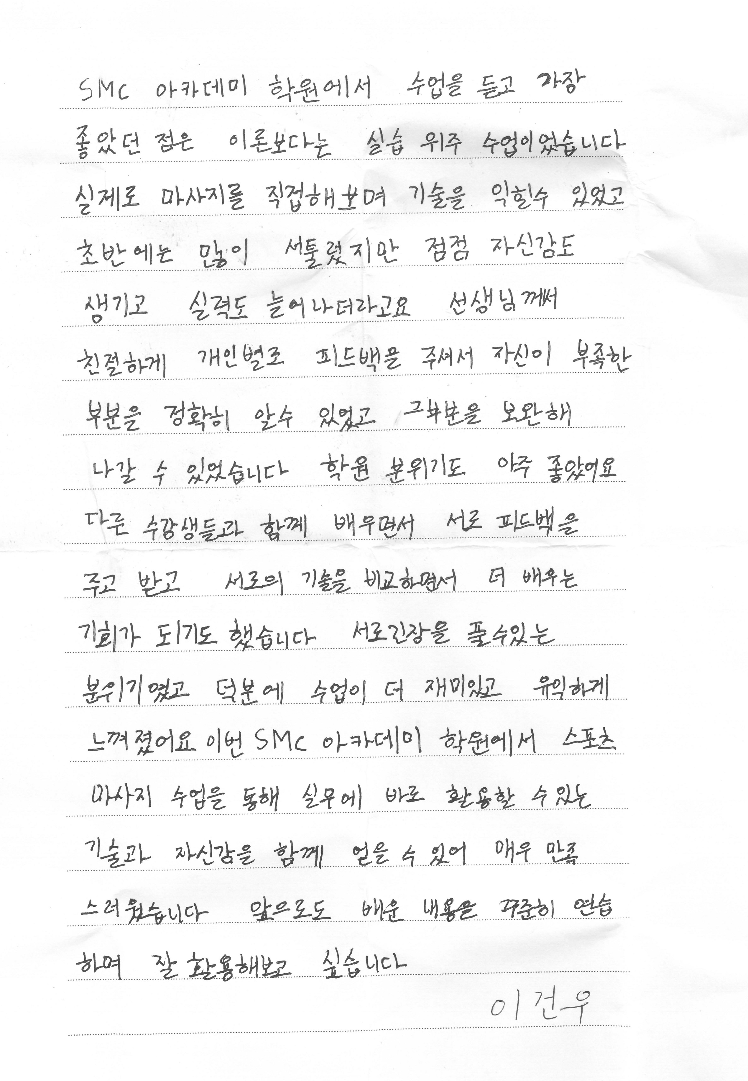 스포츠마사지 교육후기 실전에 바로활용 가능한 기술과 자신감을 함께 얻는    이건우 320