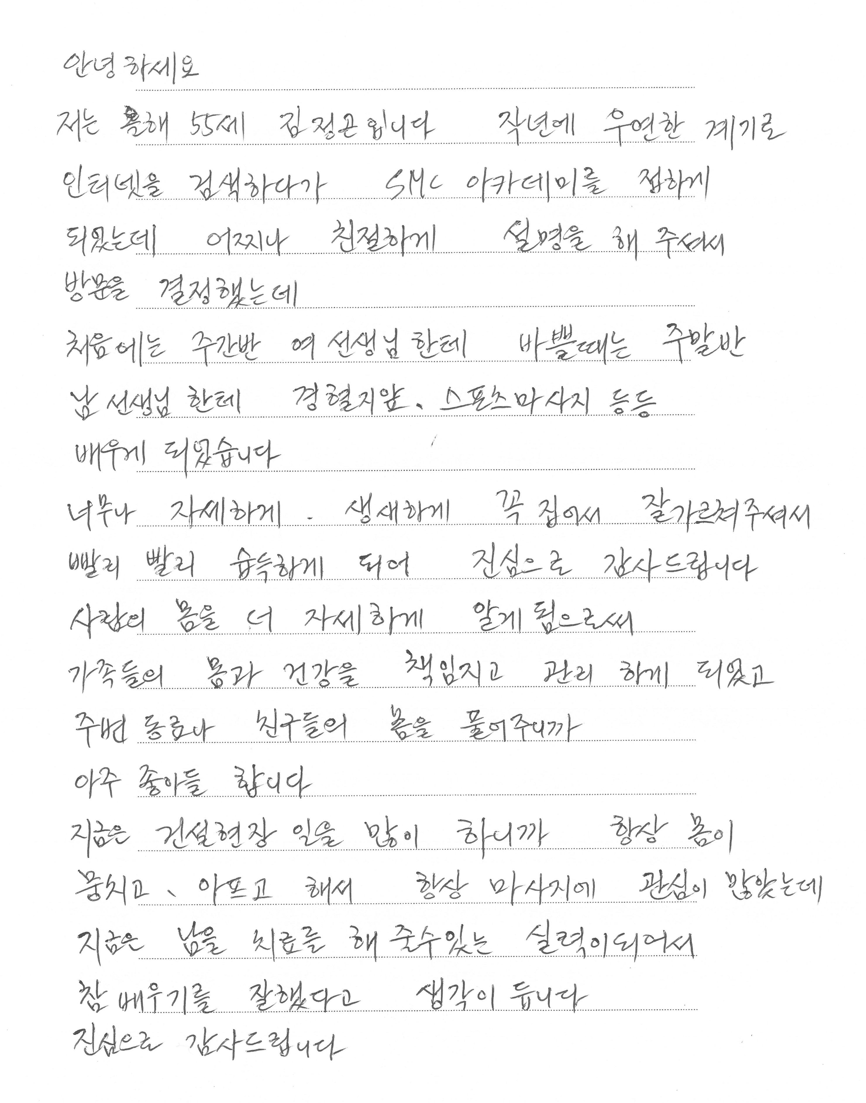 사단법인 한국건강관리사자격협회 SMC아카데미 수강생 자필후기글