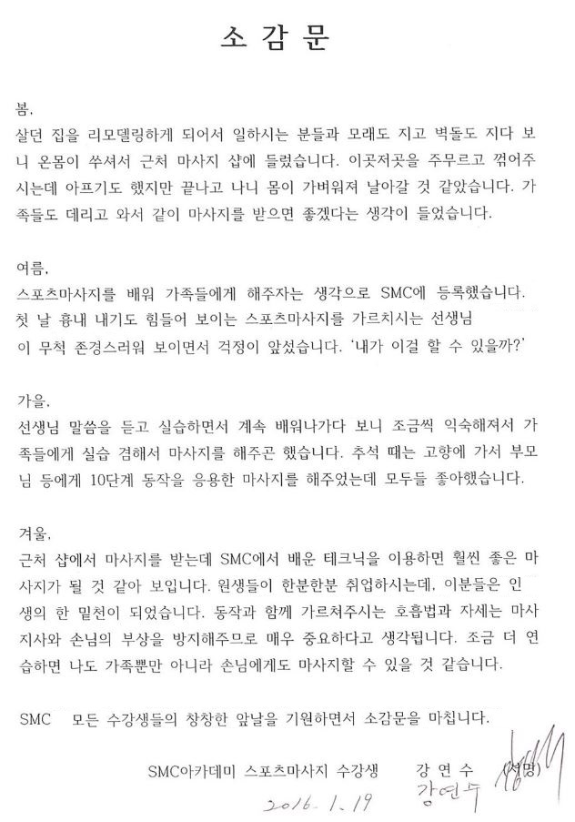 SMC에서 배운 테크닉을 이용하면 훨씬 좋은 마사지가 될 것입니다 - 강연수님