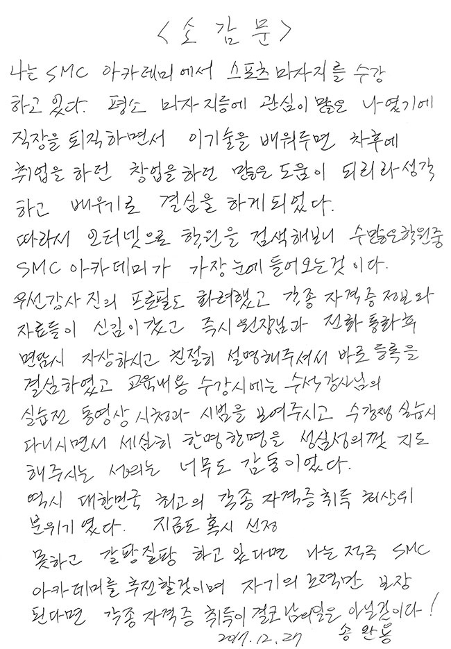 강남SMC아카데미 구로디지털단지역점서울시 관악구 시흥대로 558-1 G밸리마인드 5층, 505호사업자등록번호 : 772-11-01570