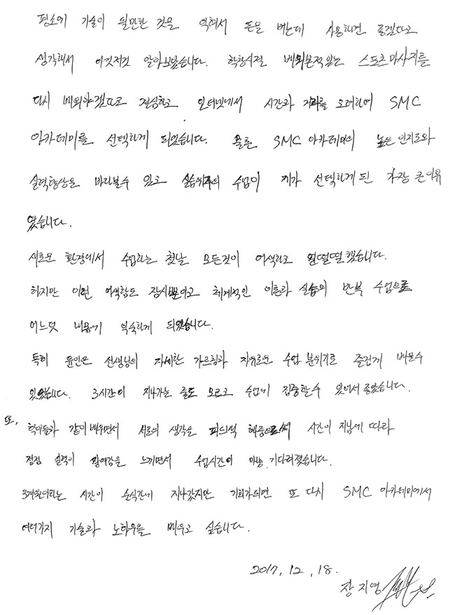 높은 인지도와 실력향상을 바라볼수 있고 실습위주의 수업이 제가 선택하게된 가장 큰 이유였습니다. -장지영님
