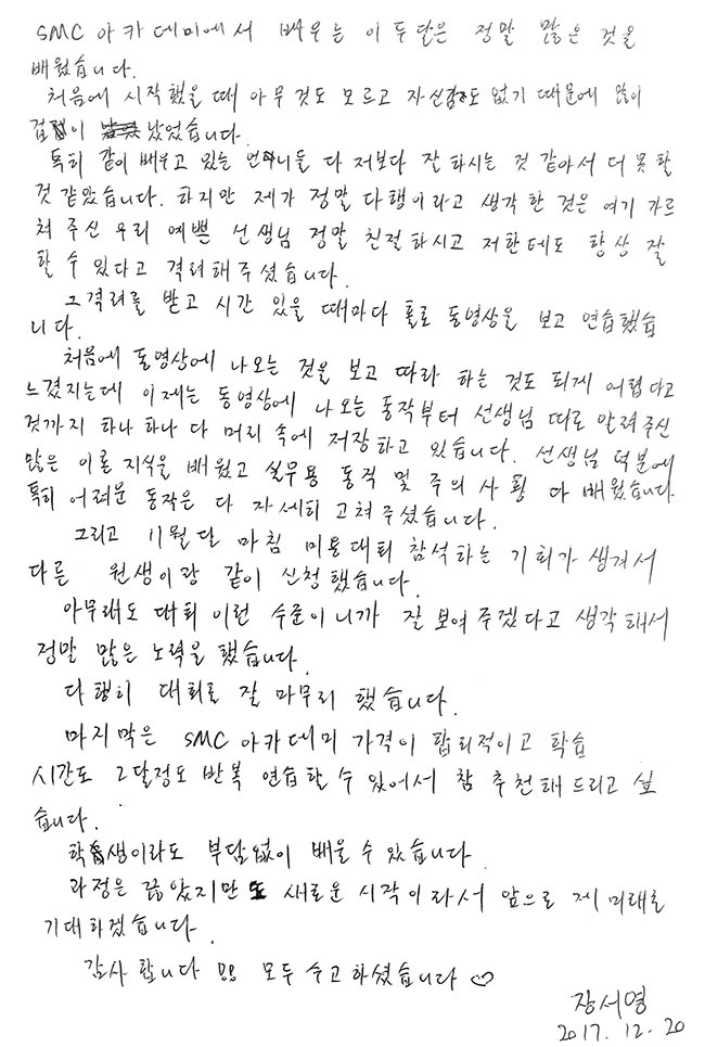 선생님 덕분에 많은 이론 지식을 배웠고 실무용 동작 및 주의사항 다 배웠습니다. -장서영님